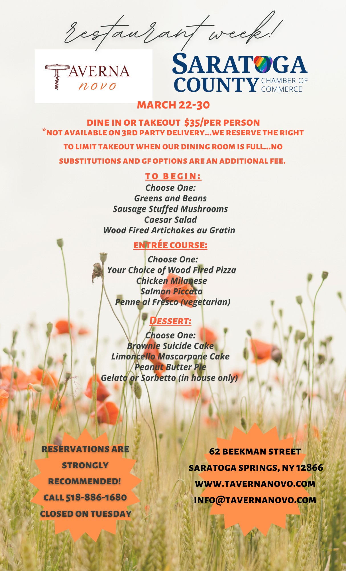 Todd Shimkus, the president of the Chamber explains, “this event is designed to support ALL local restaurants in Saratoga County...Restaurants are still dealing with uncertainty and uncontrollable factors, such as staffing shortages, random food cost spikes, and packaging challenges. If this event can help them, then we want to make it as flexible and impactful as possible.”